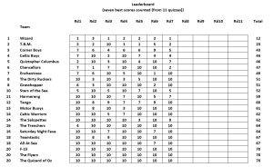 Wizard have compounded their dominance of the overall leaderboard, but with discards about to kick in their lead over T.B.M. is precarious. Other teams are playing for local bragging rights which, this week, go to Quiztopher Columbus for their mini-victory over All At Sea.