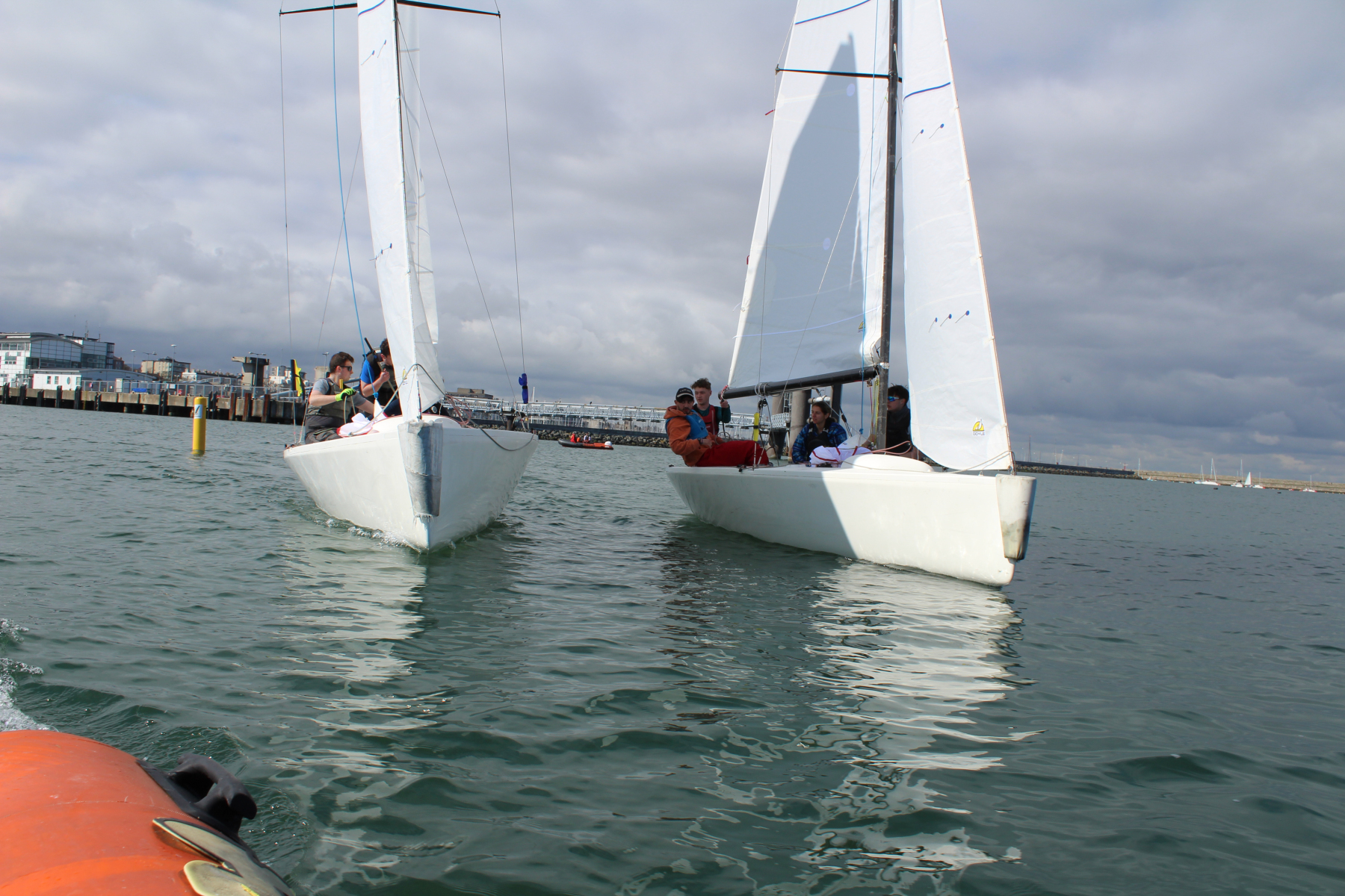 A close and competitive UCD semi-final saw UCD 1 win the first match. Tensions rose in the second match when UCD 1 did not enter on the correct side leading to UCD 2 protesting them causing UCD 1 to incur a penalty and UCD 2 going on to win the match. With UCD 1 back to the favoured starboard entry in the third match, the pre-start was close and both boats started even off the line and converged again at the windward mark, remaining close on the downwind and rounding the leeward gate at the same time.